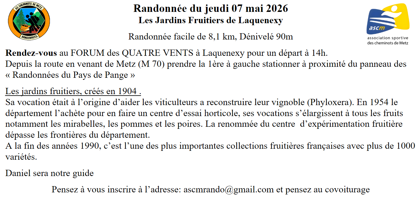 Jeudi 07 mai 2026 Les Jardins Fruitiers de Laquenexy : Randonnée facile de 8,1 km, Dénivelé 90m Rendez-vous au FORUM des QUATRE VENTS à Laquenexy pour un départ à 14h. Depuis la route en venant de Metz (M 70) prendre la 1ère à gauche stationner à proximité du panneau des « Randonnées du Pays de Pange ». Les jardins fruitiers ont été créé en 1904. Sa vocation était à l’origine d’aider les viticulteurs a reconstruire leur vignoble (Phyloxera)... Daniel sera notre guide. Pensez à vous inscrire à l'adresse ascmrando@gmail.com et pensez au covoiturage |